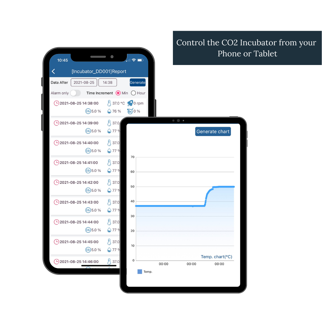 • Smartfunksjoner gjør at brukeren kan styre CTI CO2-inkubatoren fra en telefon eller et nettbrett