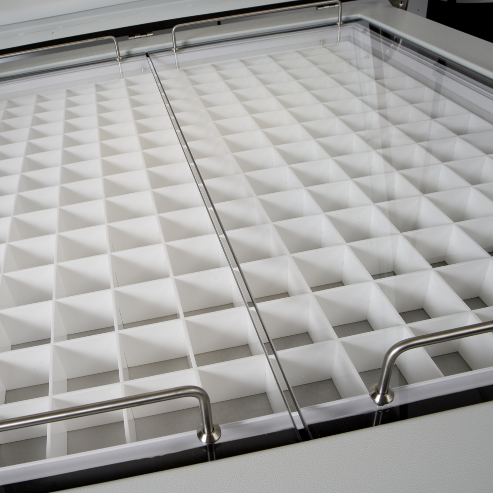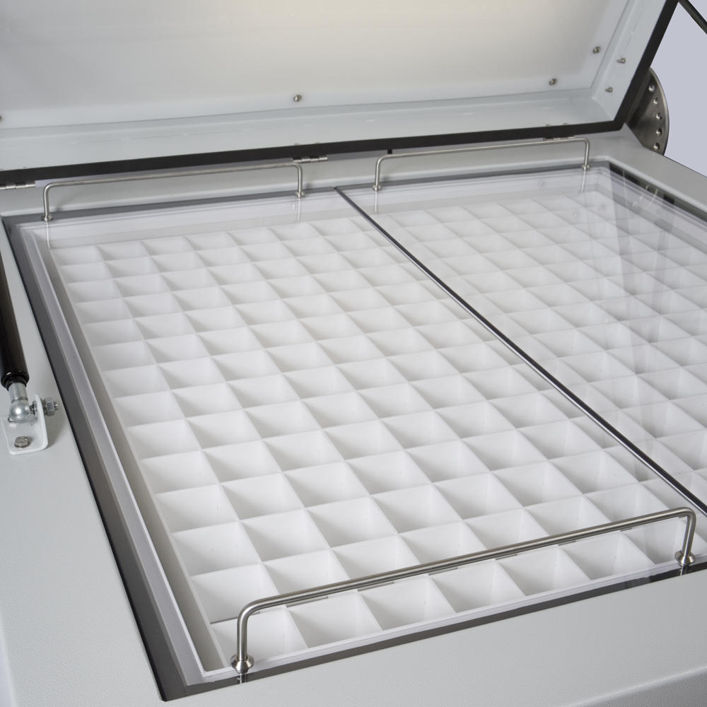 - Plexiglassruten deler arbeidsområdet inn i 196 mini-inkubatorer
