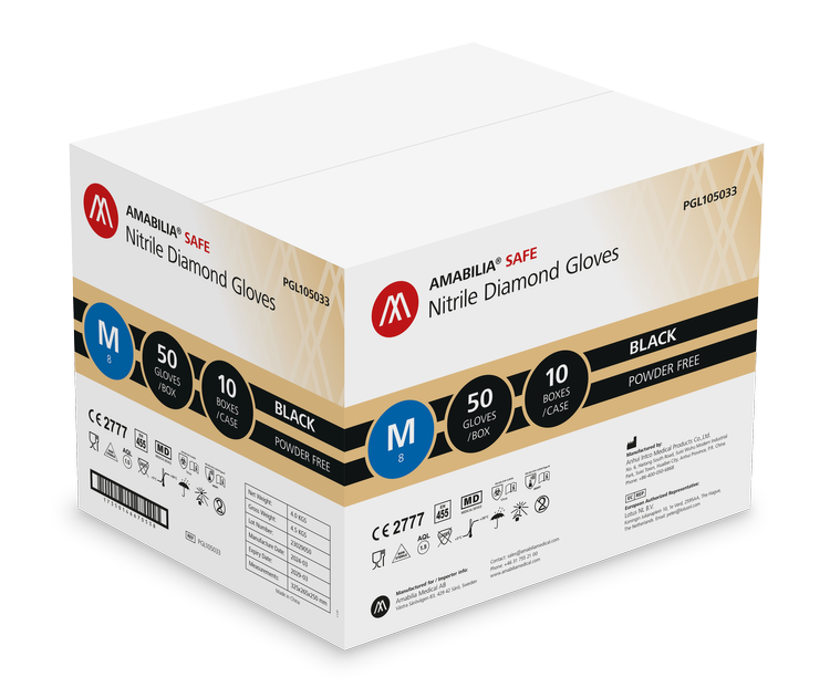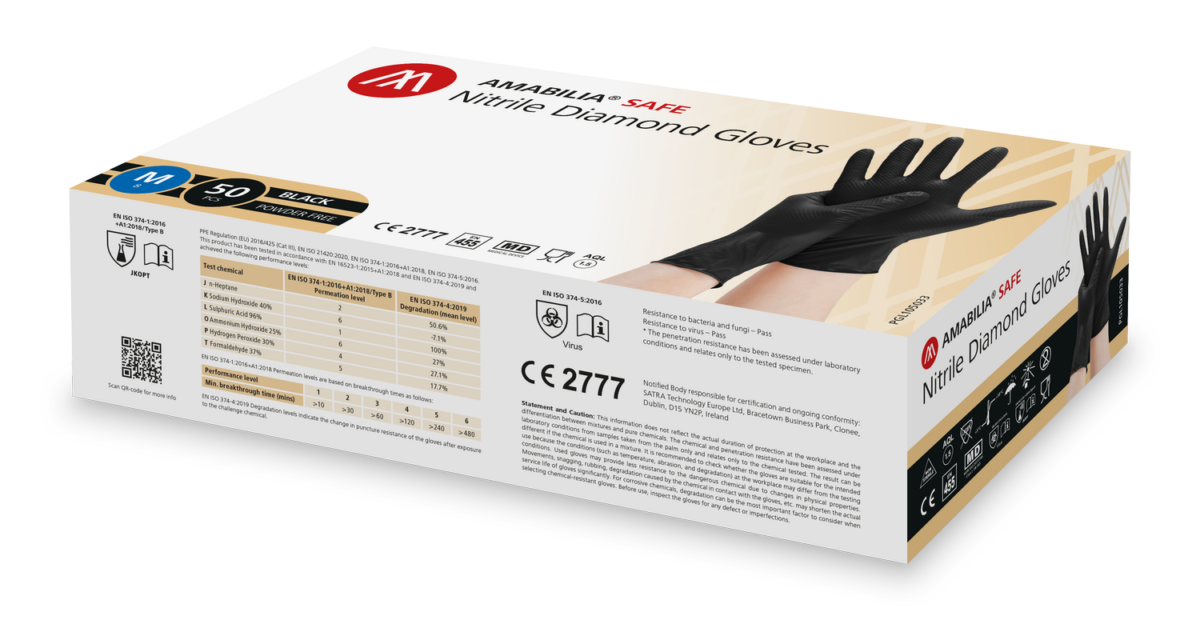 Kraftige Amabilia Safe nitrilhansker med diamantstrukturert overflate gir eksepsjonell komfort, kvalitet og grep under våte og tørre forhold. Diamantteksturen gir overlegen gripeevne og holdbarhet, med omtrent dobbelt så stor tykkelse som standard undersøkelseshansker. Hanskene er svært elastiske, kjemisk motstandsdyktige og punkteringssikre, og de er ergonomisk utformet for å passe perfekt og forebygge tretthet i hendene.