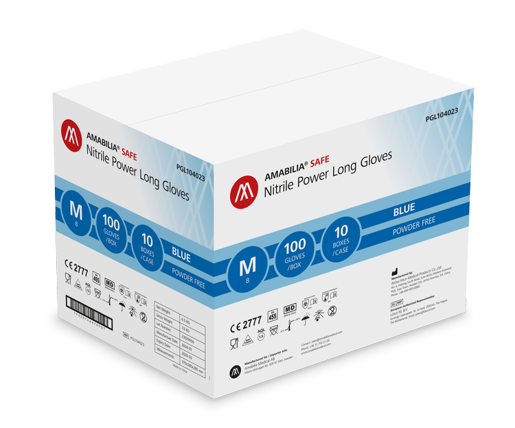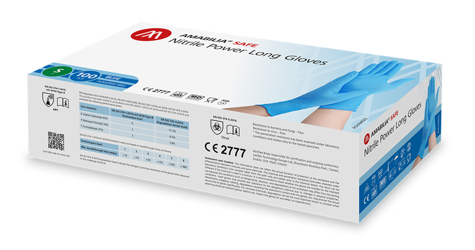 Amabilia Safes lange nitrilhansker er ideelle for rengjøring, helsetjenester og kjemikaliehåndtering, og gir utmerket beskyttelse mot infeksjoner og forurensning. Også tilgjengelig i hvit.