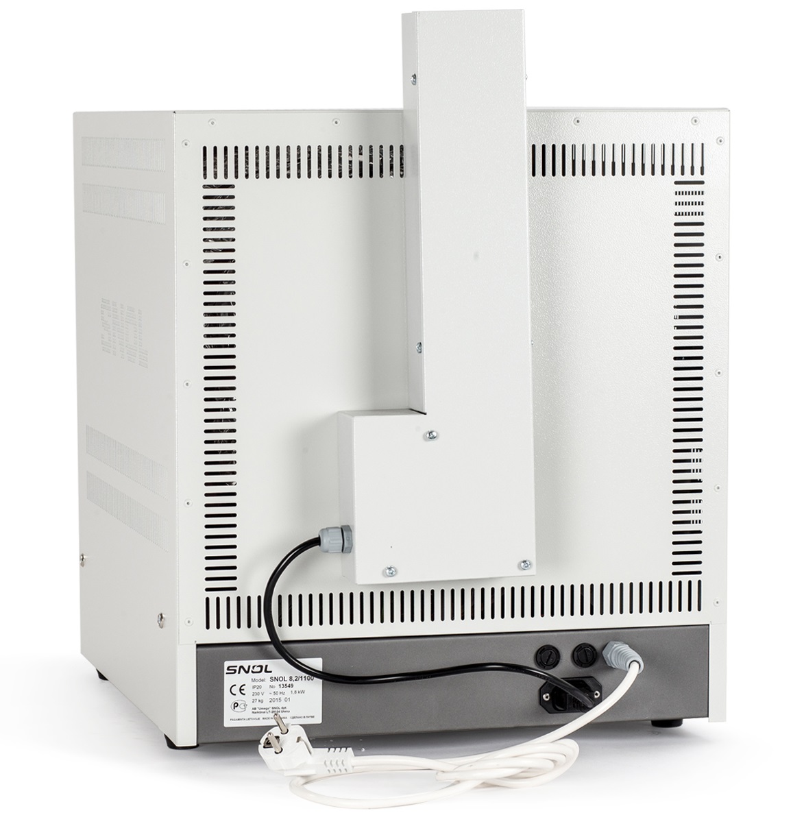 SNOL 13/1100 askingovn med vakuumformet keramisk fiberkammer er konstruert for asking og avbrenningsprosesser opp til 1100 °C. Vifteassistert skorstein gjør det mulig å fjerne røyk fra kammeret under prosessen.