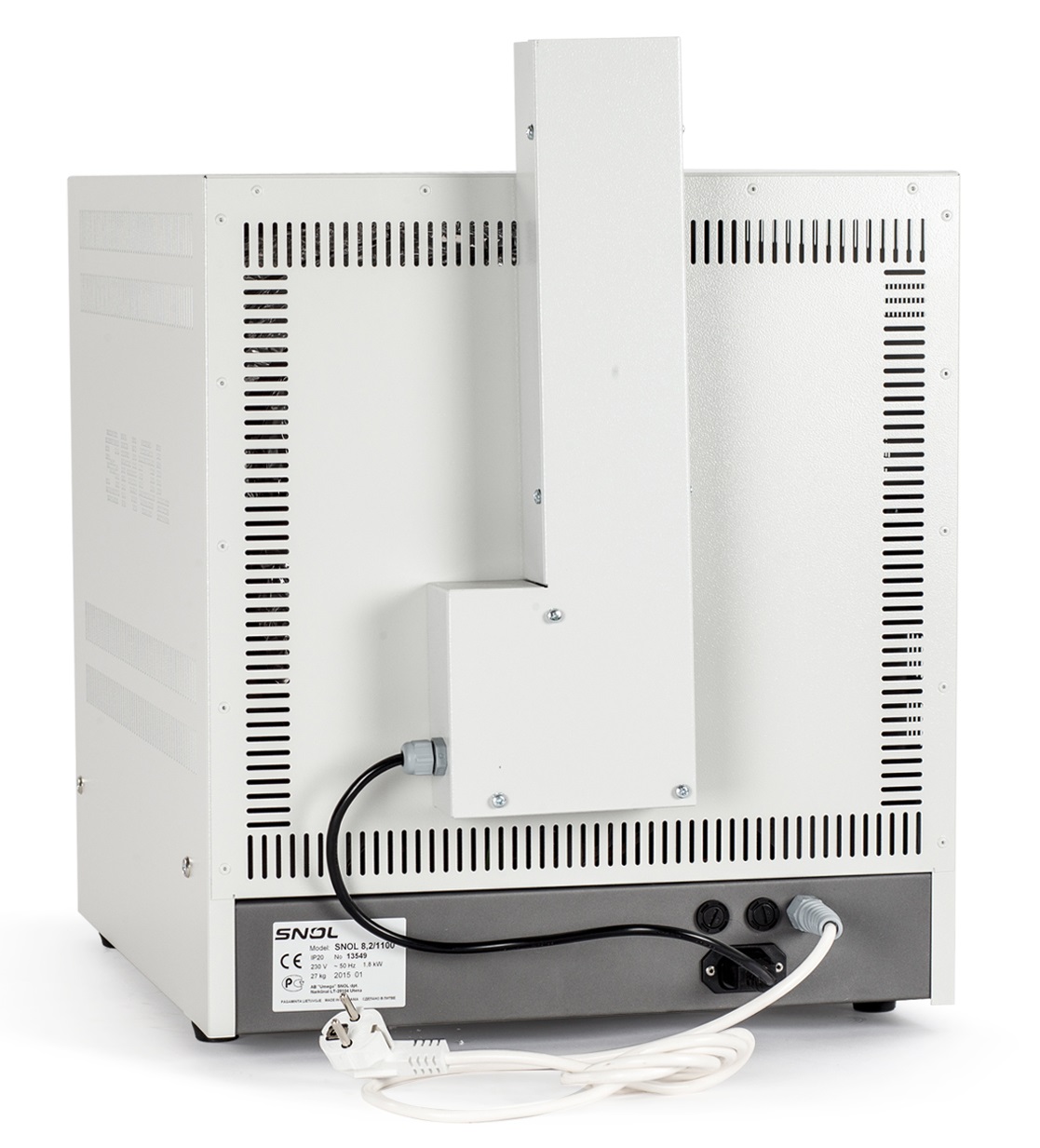 SNOL 22/1100 askeovn med vakuumformet keramisk fiberkammer er konstruert for aske- og avbrenningsprosesser opp til 1100 °C. Den vifteassisterte skorsteinen gjør det mulig å fjerne røyk fra kammeret under prosessen.