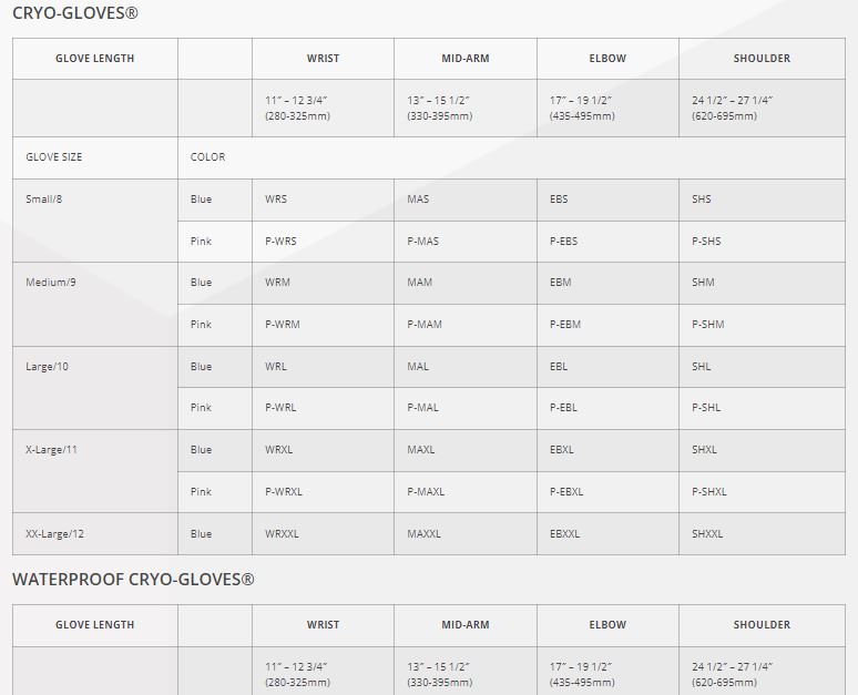 Innhold: Vanntette Cryo-Grip®-hansker albue / Cryo-Apron® 48″ / Cryo-Gaiters™ / Cryo-Protection® ansiktsskjerm